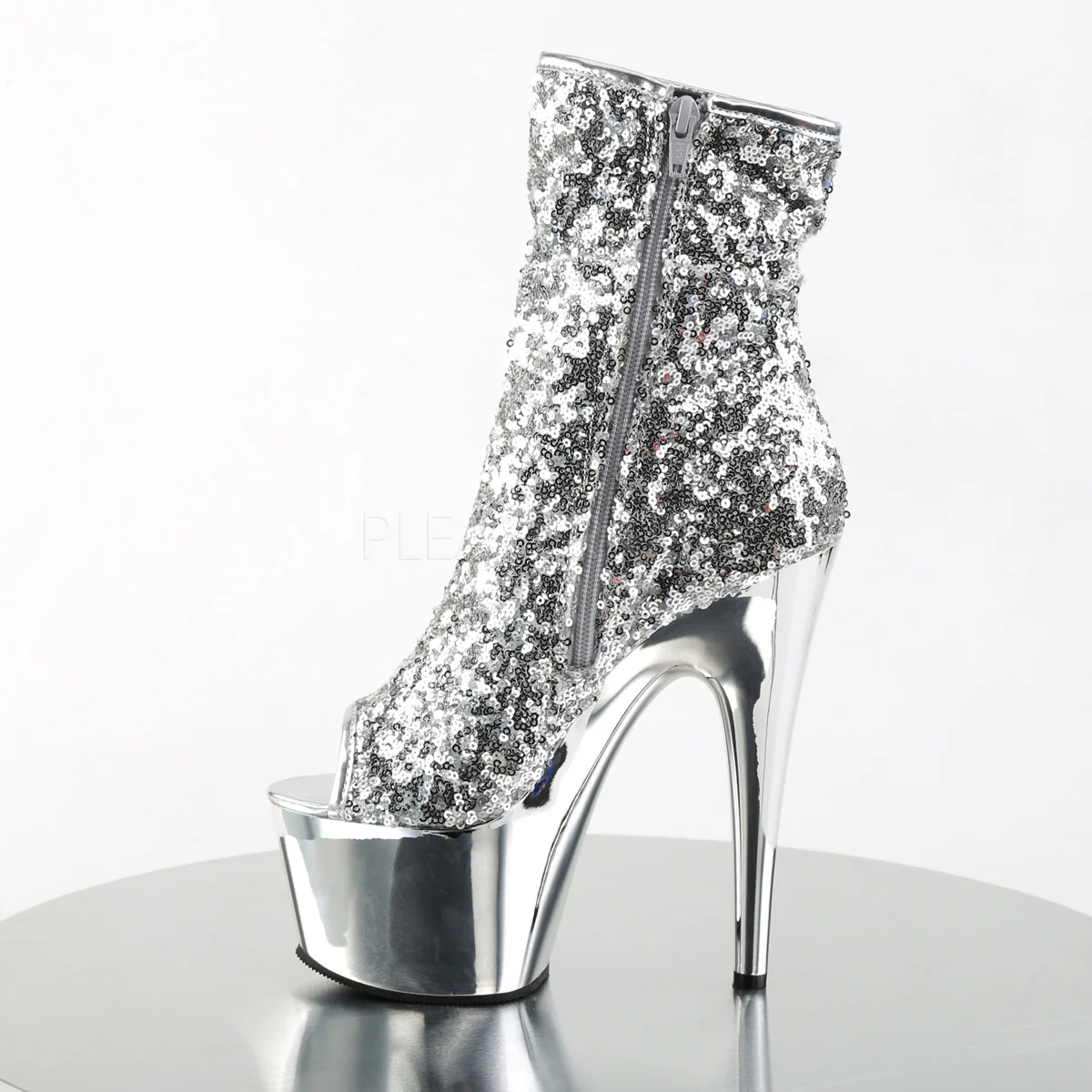 Full Description: 7" Heel, 2 3/4" PF Peep Toe Sequins Ankle Boot, Side Zip